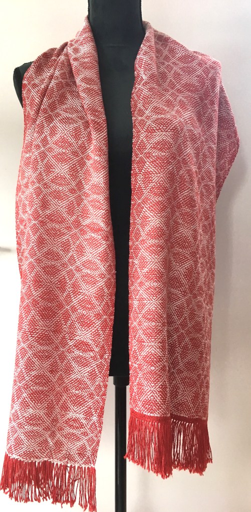 In de rood witte sjaal zie je het patroon duidelijker, de witte bourette-zijde geeft een iets dikkere sjaal.