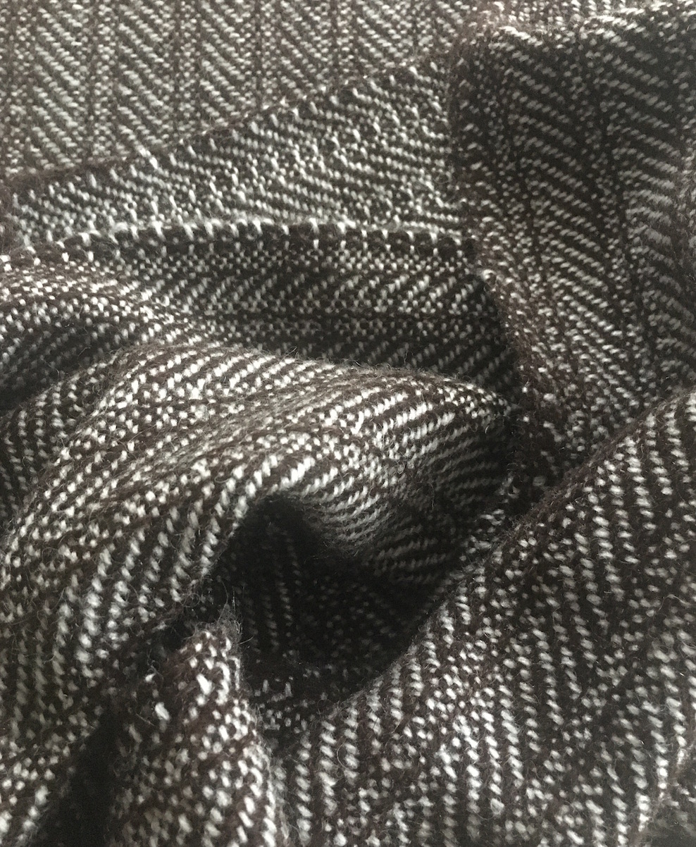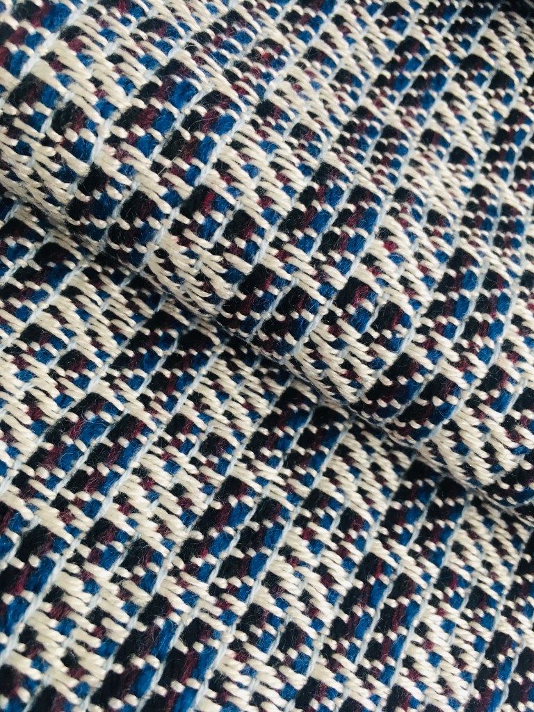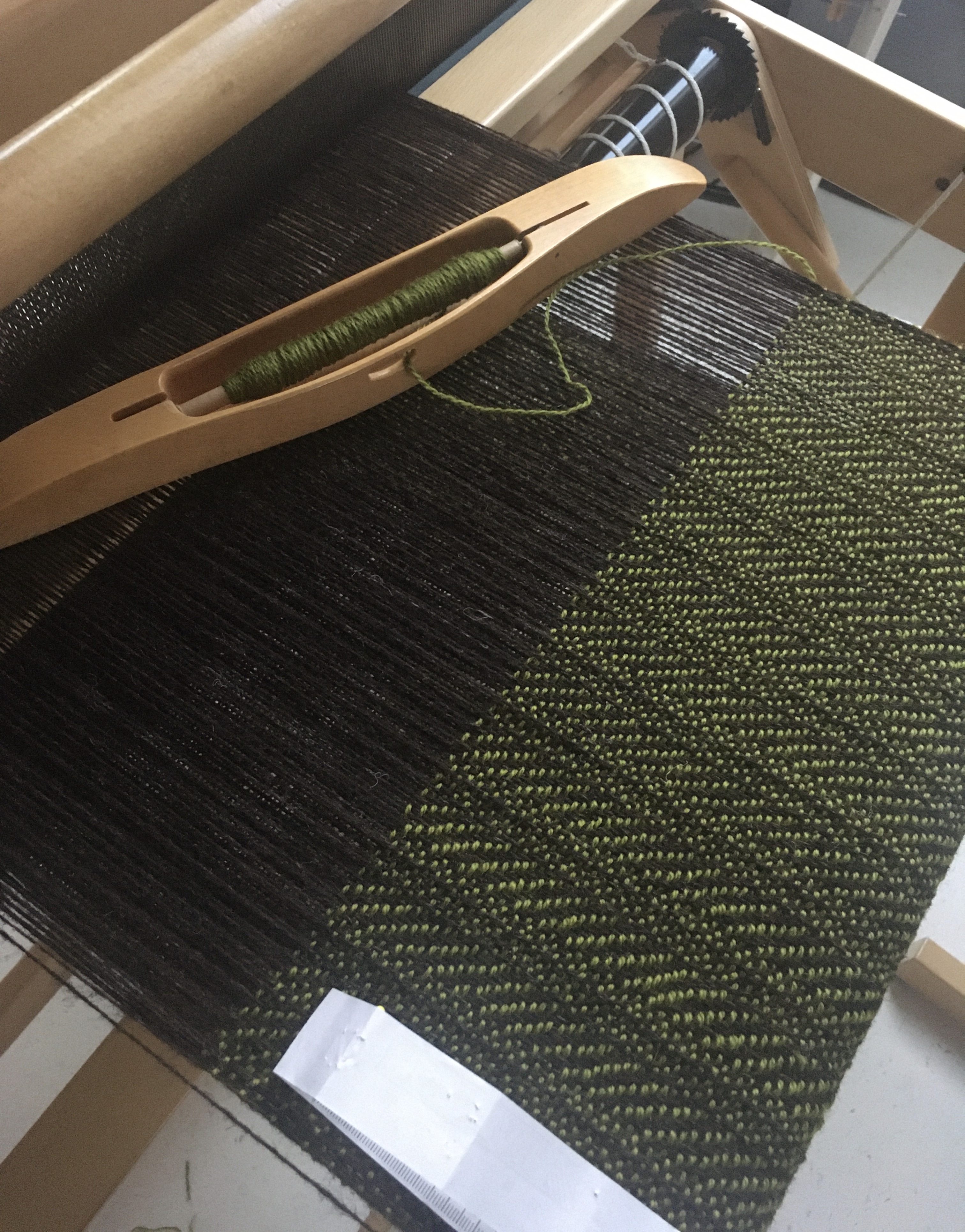 Dit weefsel is een schaduwweefsel, een heerlijk soepele wollen stof, nu nog enkele meters te gaan. Bijna zwarte bosbes merinoswol met jeans-blauwe merinoswol.