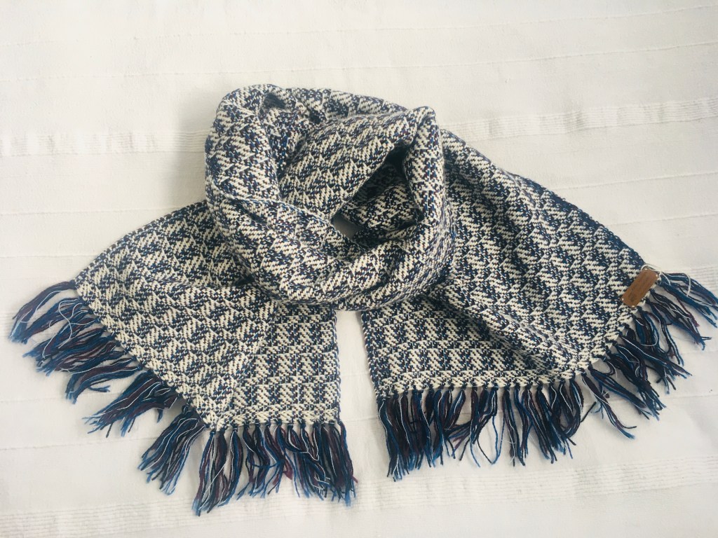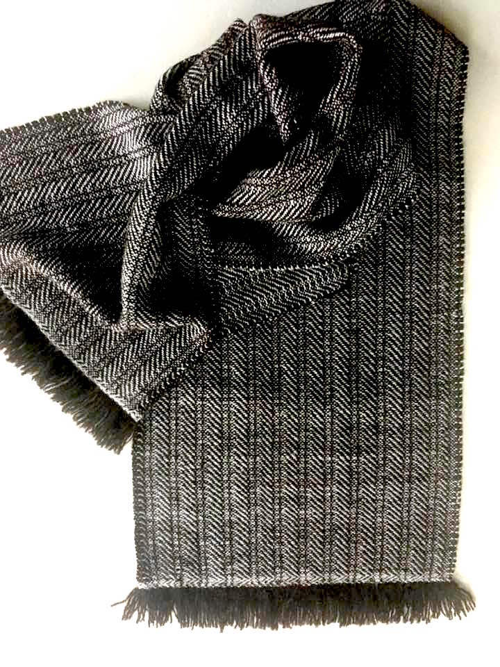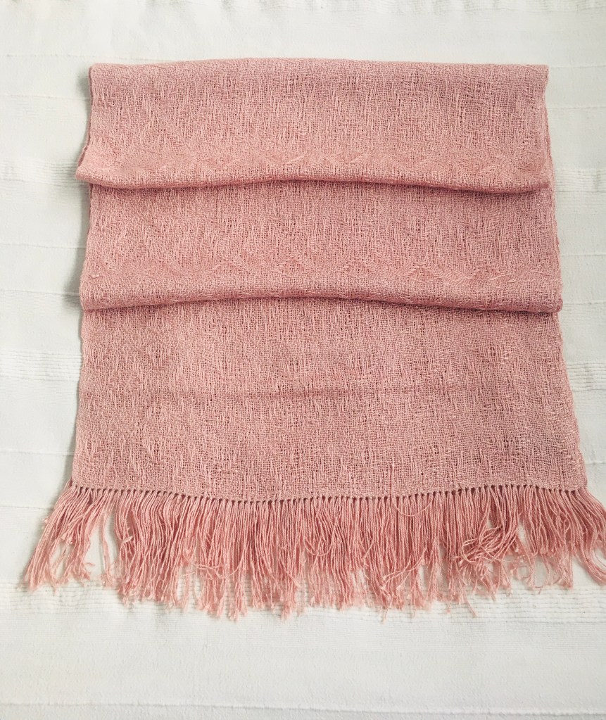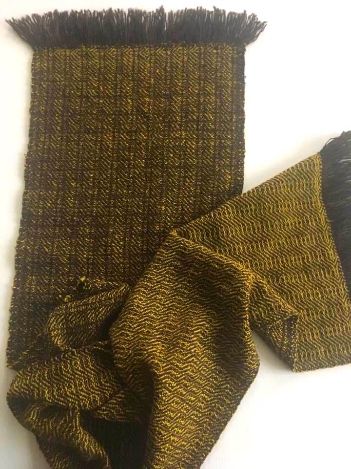 Het weven met zijde geeft een gelukzalig gevoel. De fijne super zachte garens de glans en het ‘lichte’ van het materiaal. Heerlijk, zo te weven maakt dat de gedachten tijdens het werk luchtig worden. Ik hoop dat degene die dit fantastische werkstuk gaat dragen er iets van mee krijgt. Maat: 200 x 48 cm + 15 cm gedraaide franjes aan de smalle kanten.