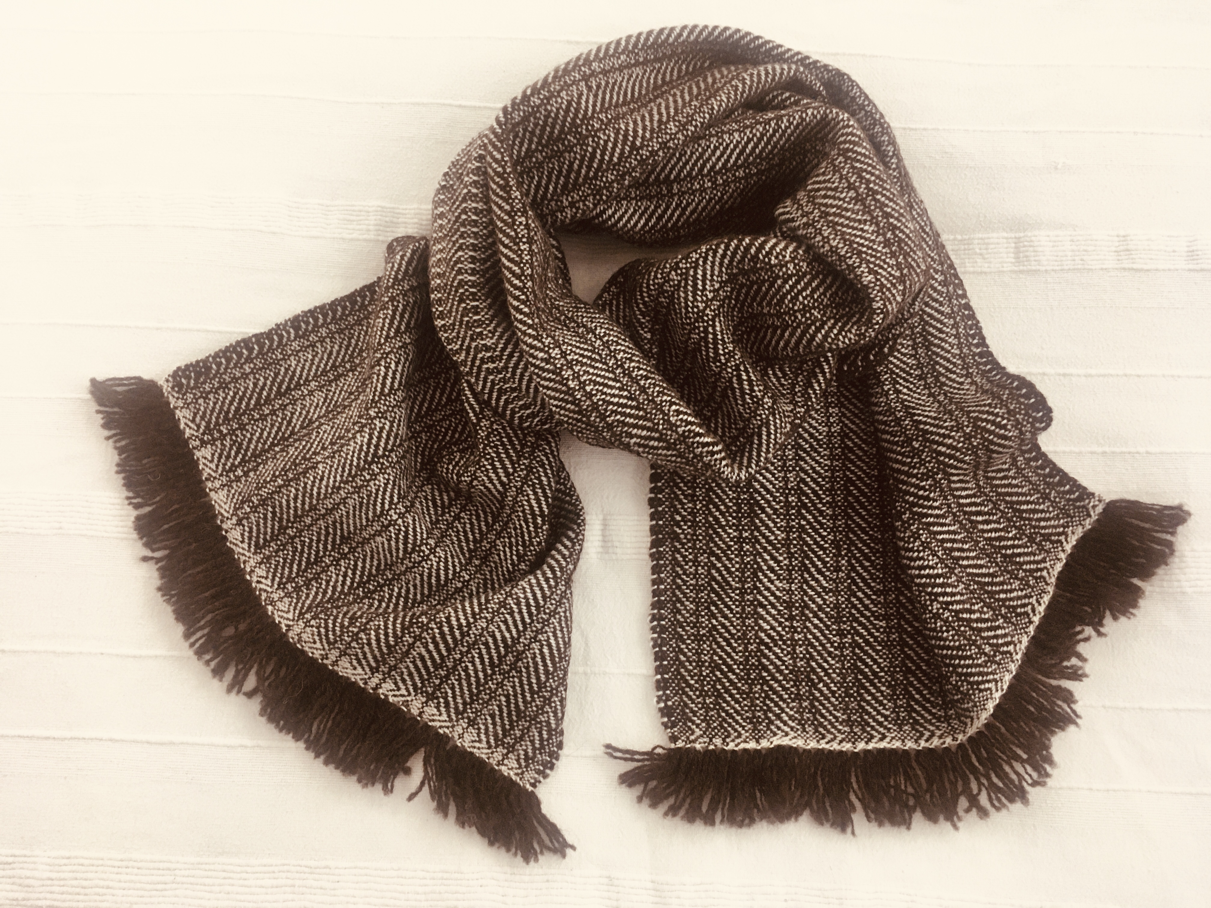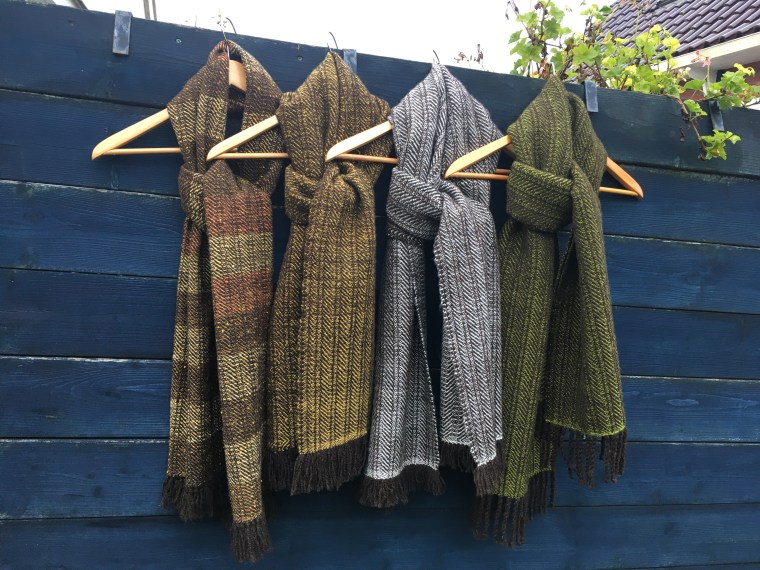 Nieuwe sjaals van het weefgetouw. Op een natuurlijke bruine wollen ketting zijn vier sjaals geweven. Zacht en soepel, de witte in het donkerbruin heeft een wolmengsel 70% wol. Het gekleurde garen is vooral zijde, de sjaal is 70% wol 30% zijde. De mosterdgele bestaat uit ± 80% wol 20% zijde. De groen met bruin is 100% wol.