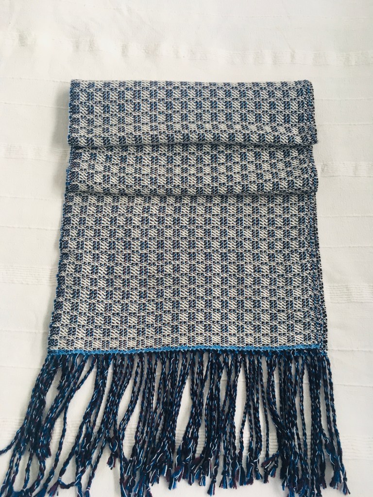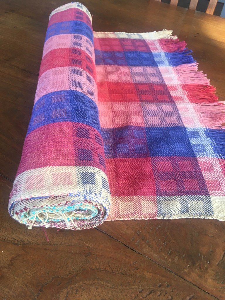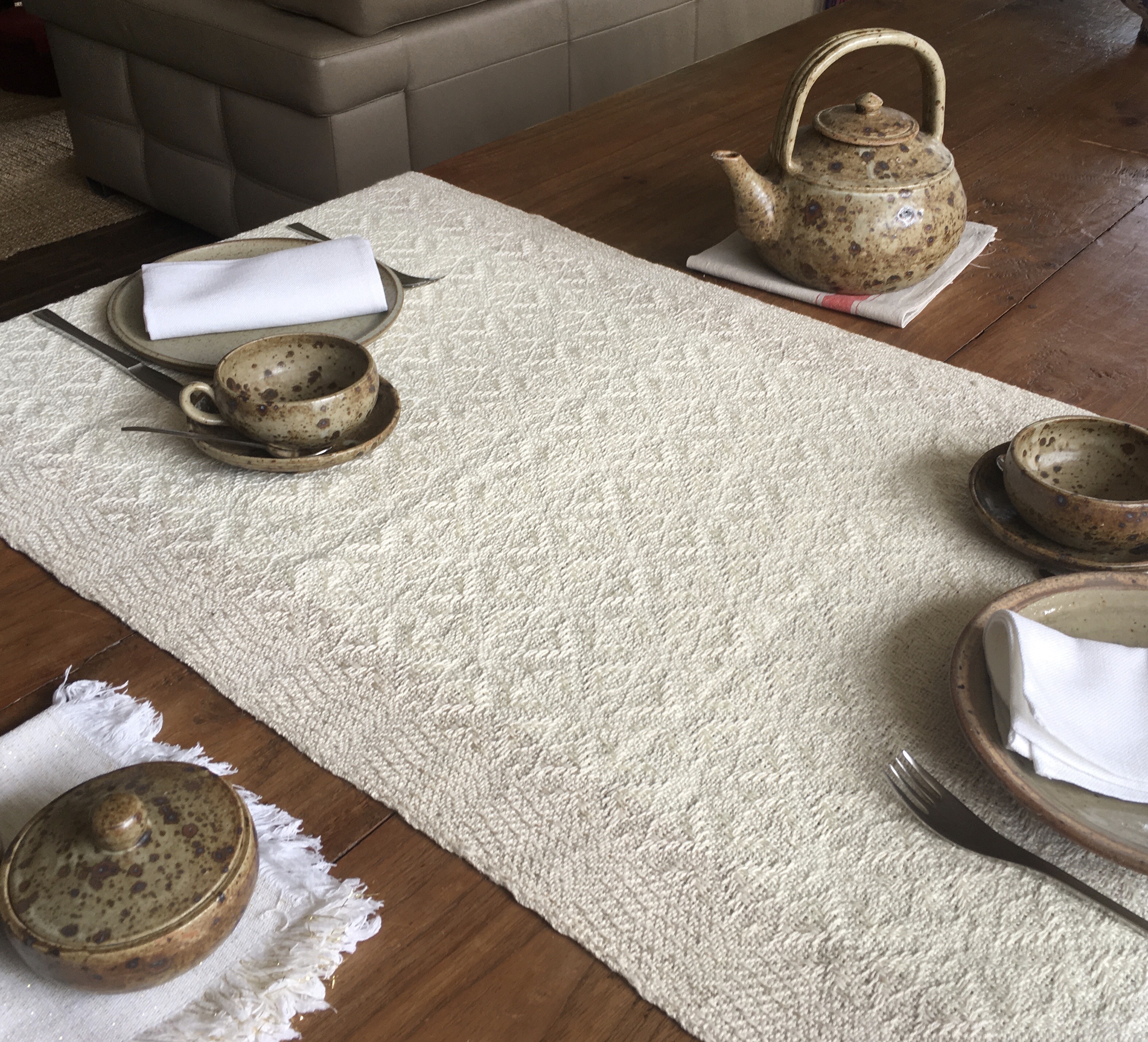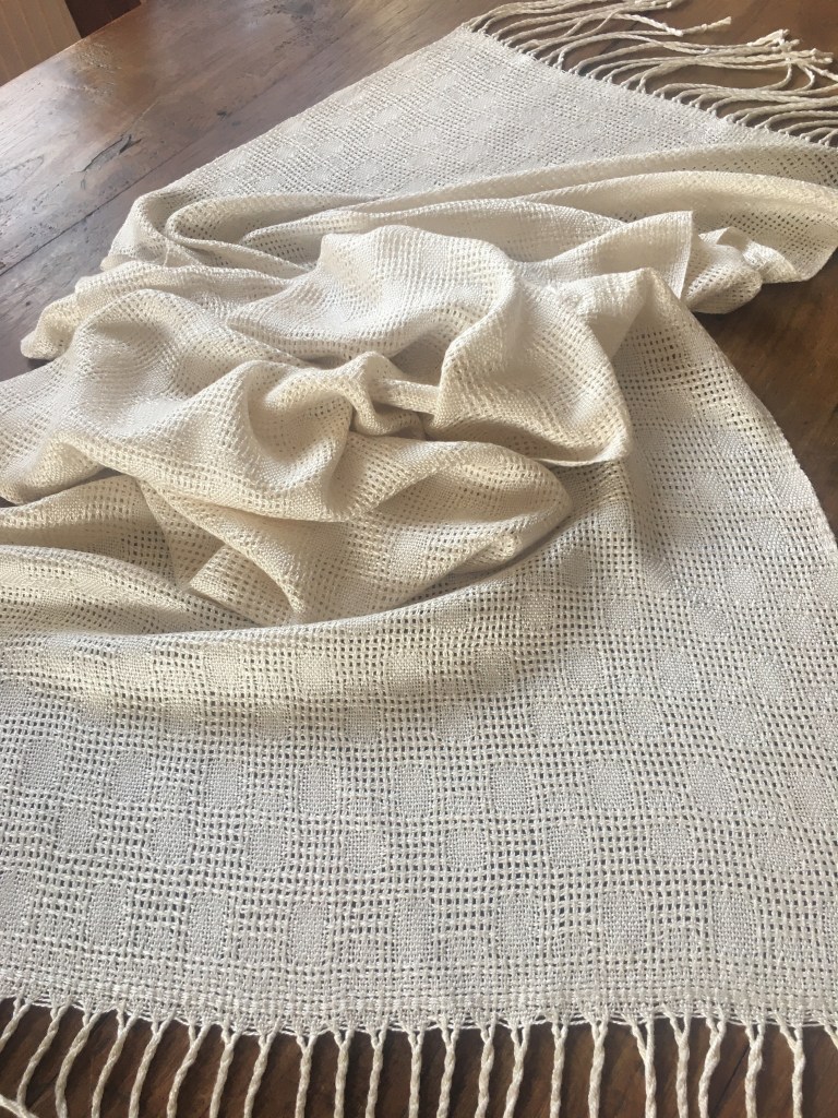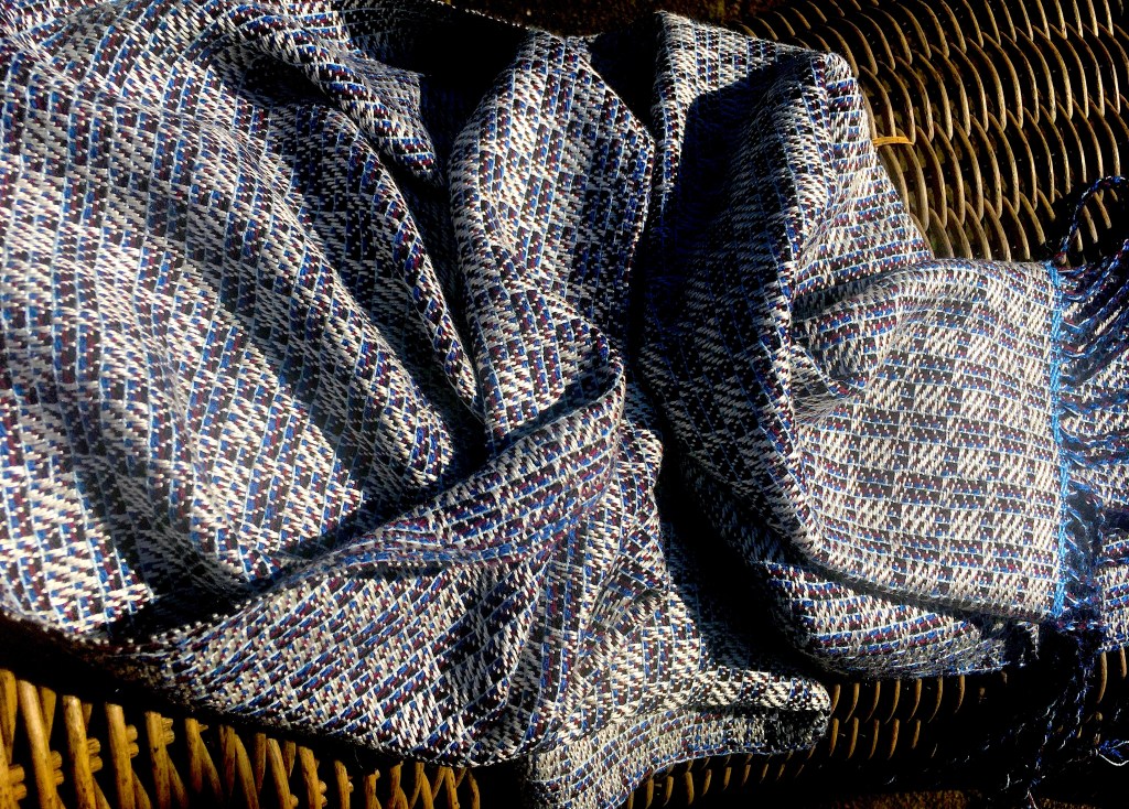 Dit weefsel is op een handweefgetouw geweven met een zogenaamd ‘crackle weave pattern,’ het patroon is een oud ontwerp. Geweven met 6 schachten en 46 inslagen per patroontje.