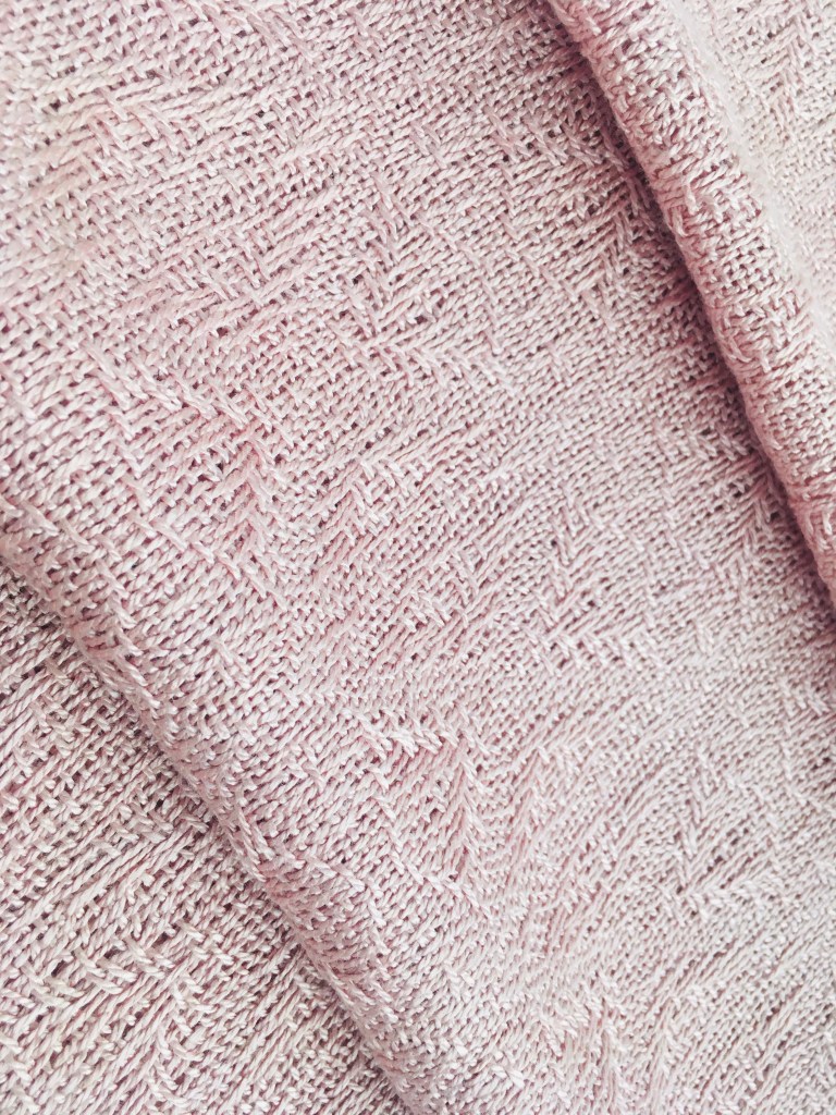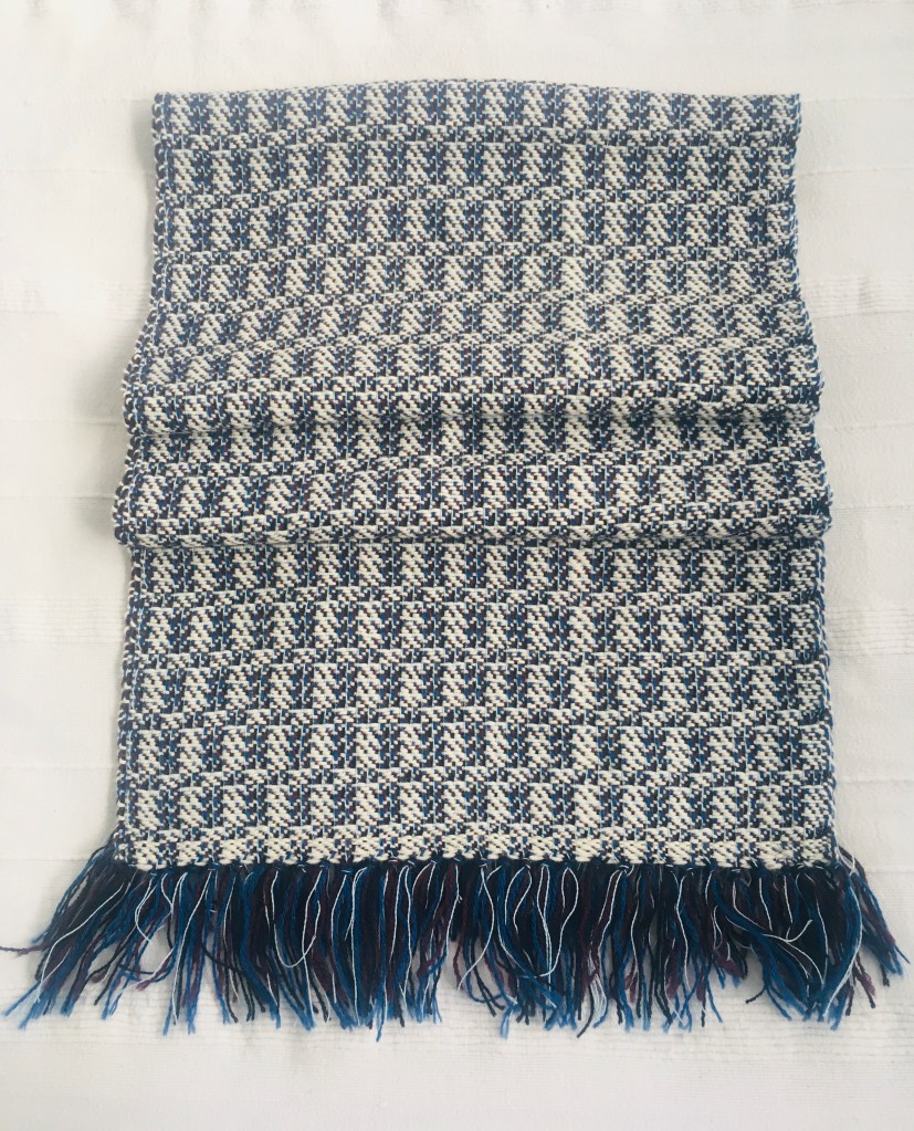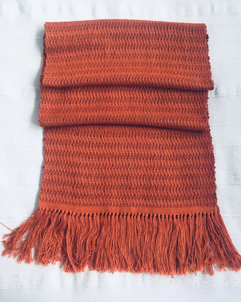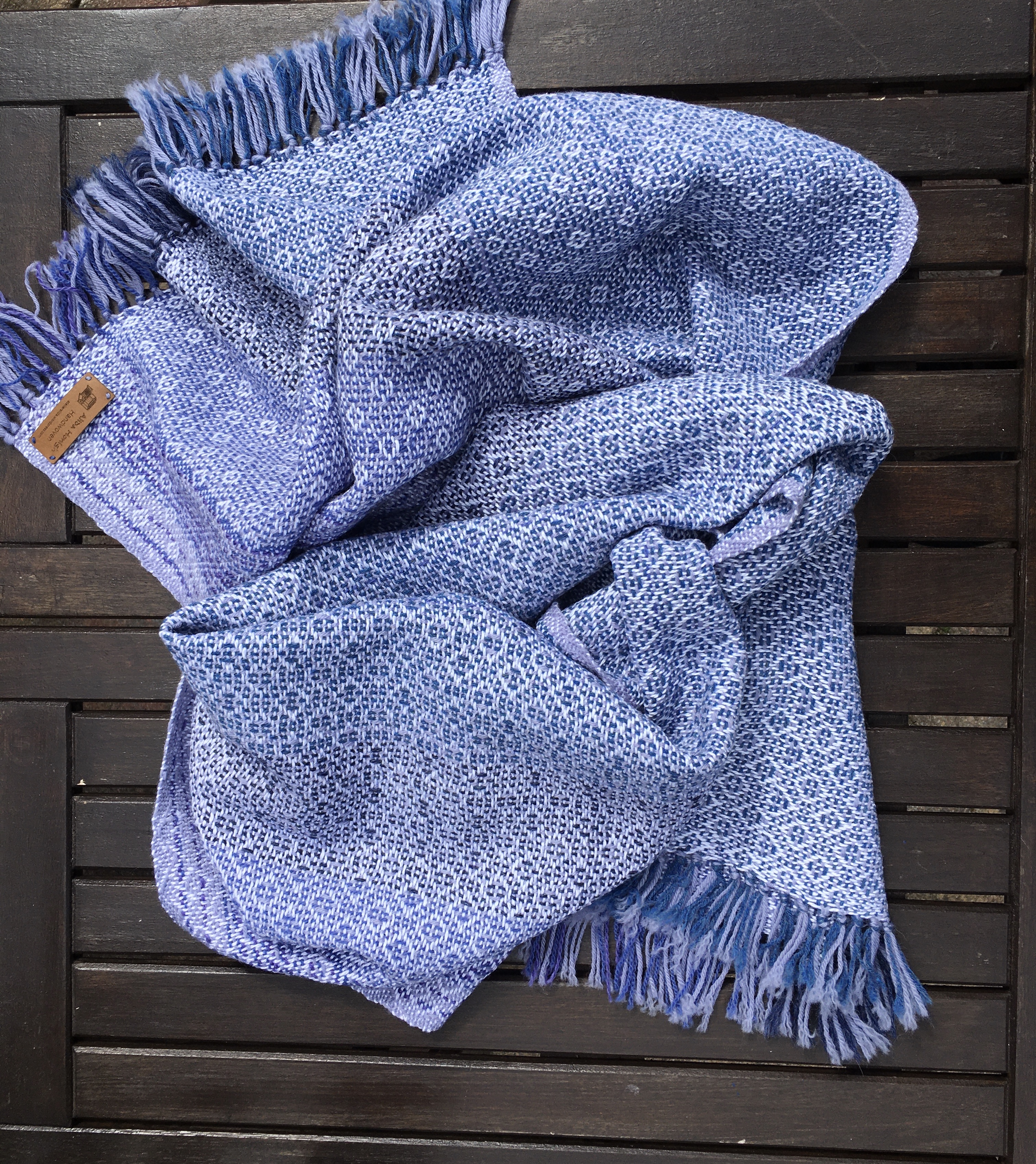 Dit weefsel is op een handweefgetouw geweven met een zogenaamd ‘crackle weave pattern,’ het patroon is een oud ontwerp. Geweven met 6 schachten en 46 inslagen per patroontje.