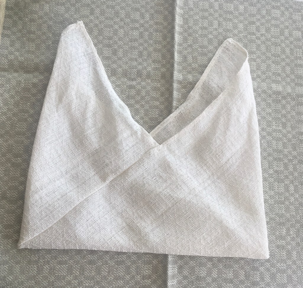 Meditatiekussen, bovenkant en handgreep van handgeweven stof in vlecht-keperpatroon met wol. Zijkant en onderkant genaaid van linnen of katoenen stof. Binnenkussen van katoen gevuld met boekweit-doppen. Het kaf van boekweit is fijn vulmateriaal, de vorm blijft goed en het kussen zit stevig.