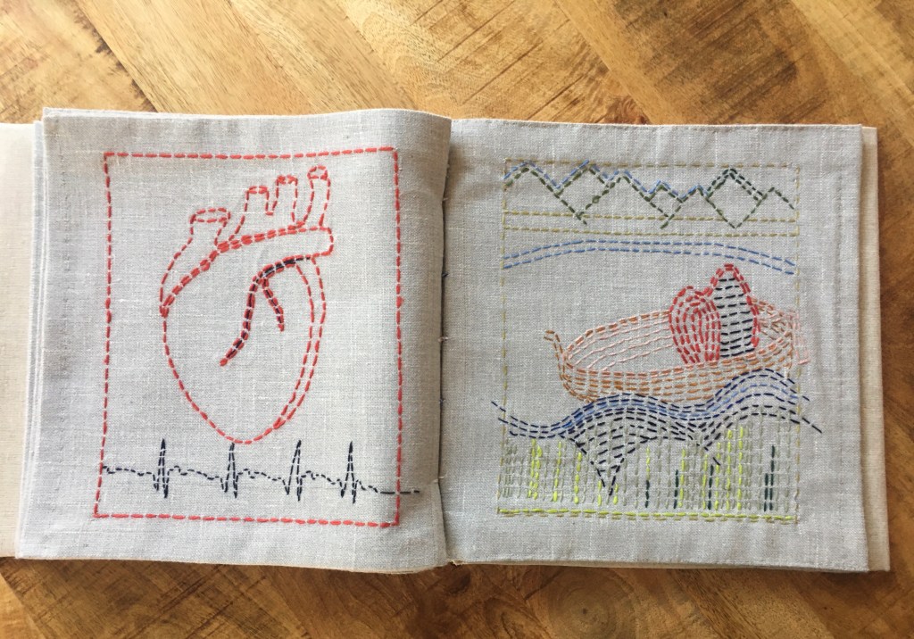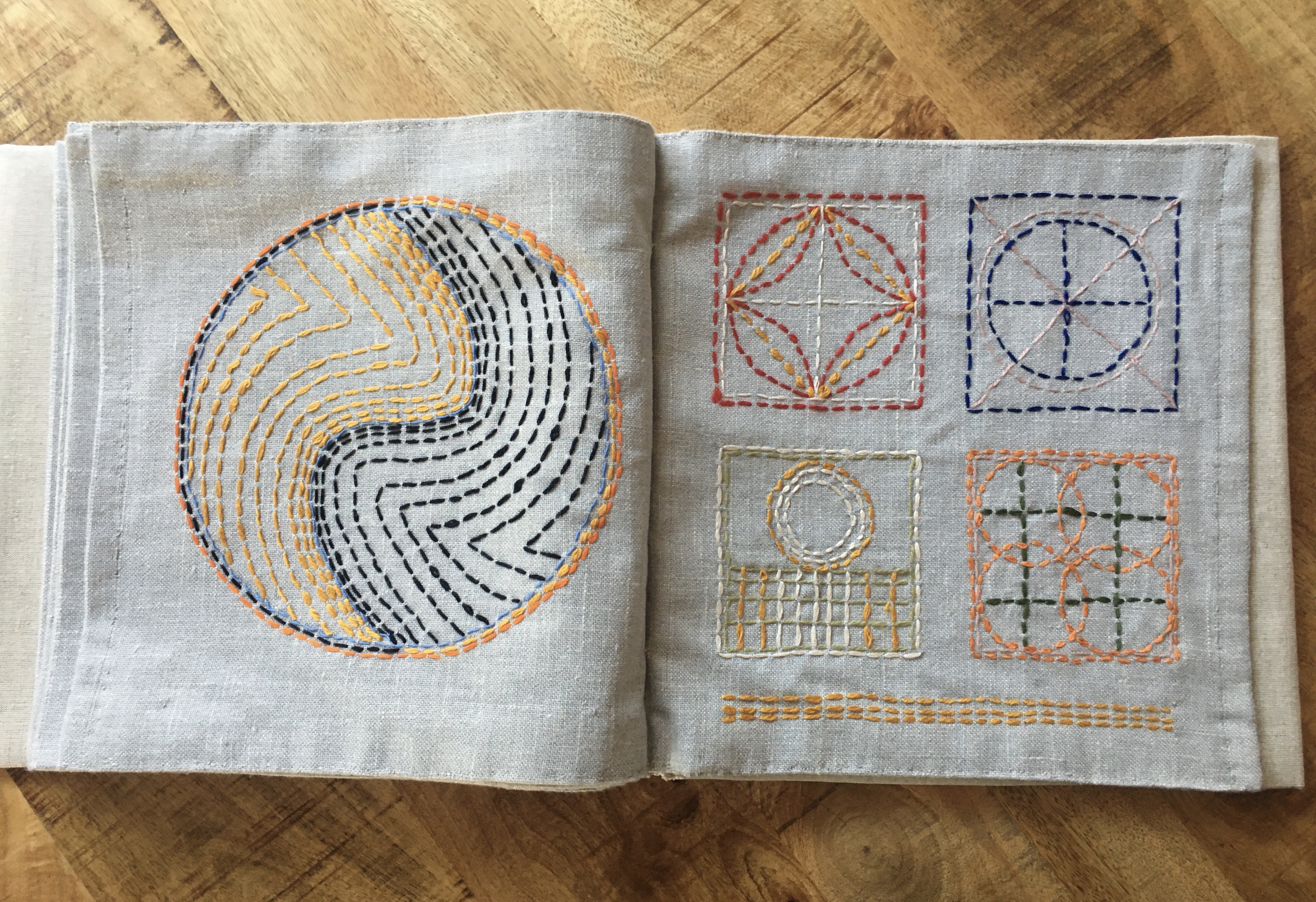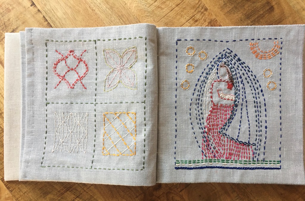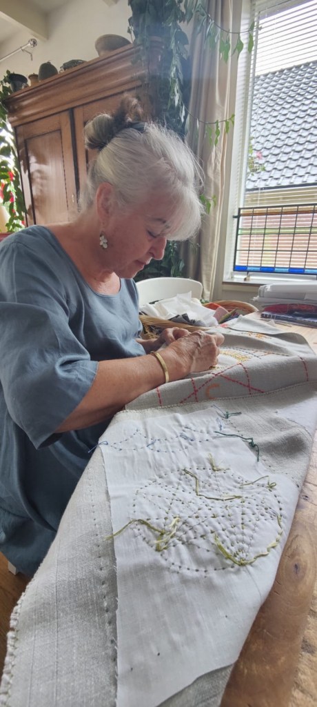 Borduren is zo anders dan weven, ik had kennis gemaakt met Sashiko het Japanse steekjes zetten. Heel leuk om te doen kleine lapjes stof versieren met als doel de stof dikker en steviger te maken. Het nodigde me uit om iets te gaan borduren. Misschien zou beeld weven meer in mijn lijn liggen maar ik hou wel van zijsprongen. Ik begon met steekjes zetten, de onderwerpen of afbeeldingen blijken van betekenis voor mij, ik noem het symbool borduren. Het is een boek geworden.