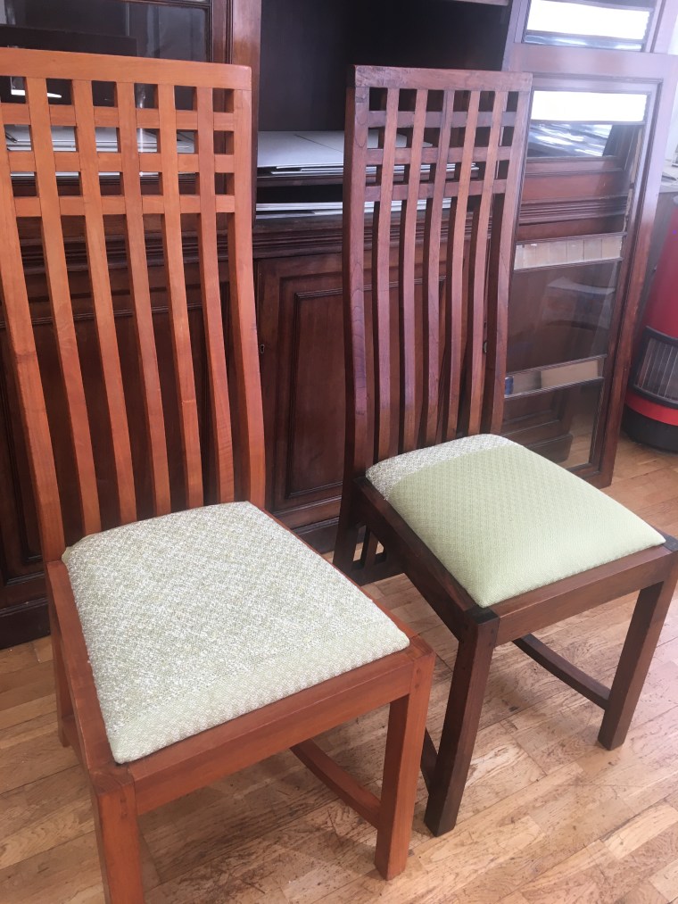 Deze stoelen waren toe aan een nieuwe bekleding, het is een soepele sterke stof geworden van zijde en bouclé