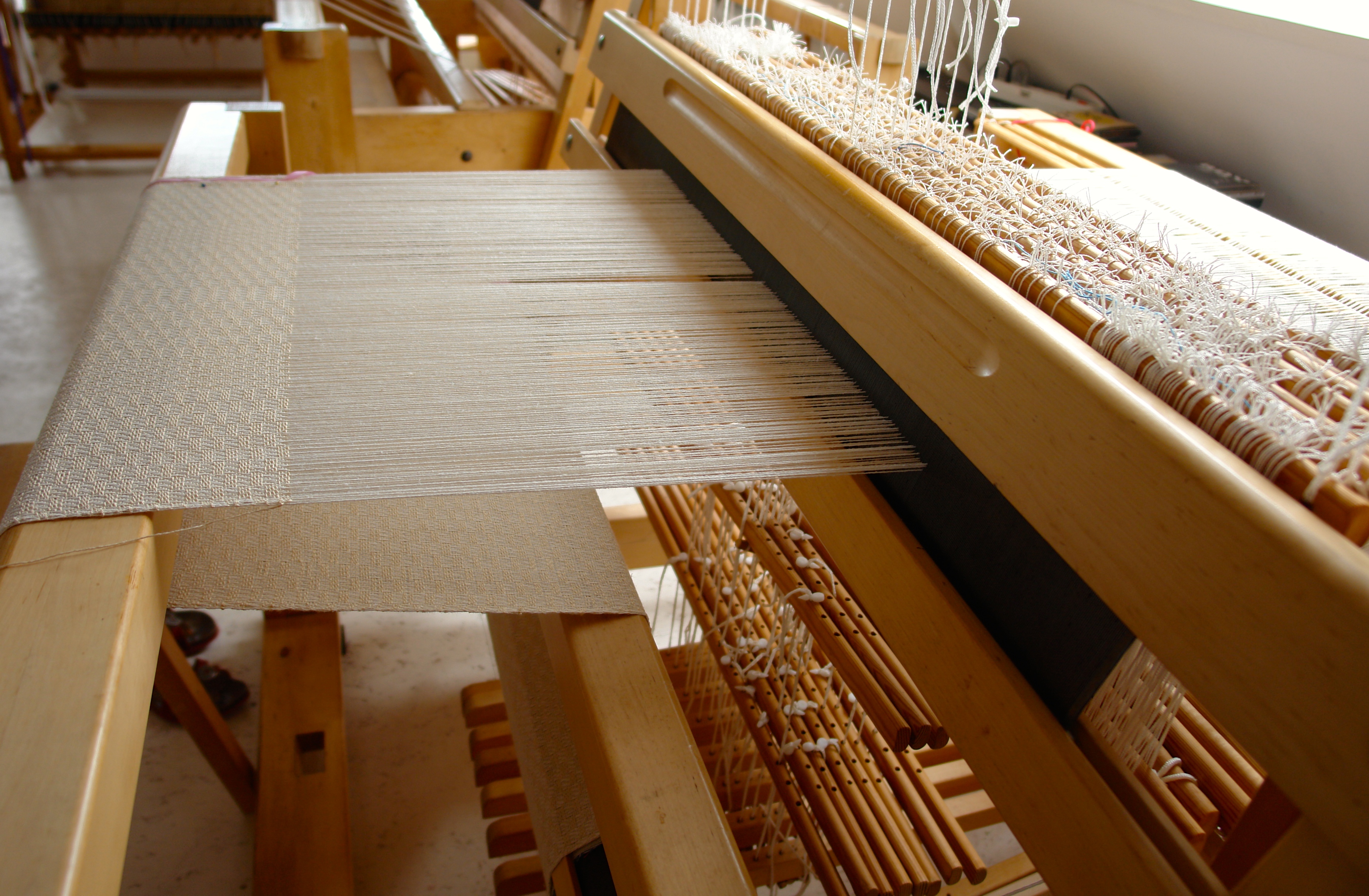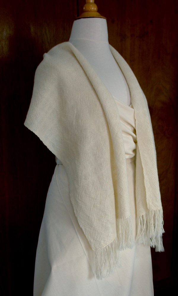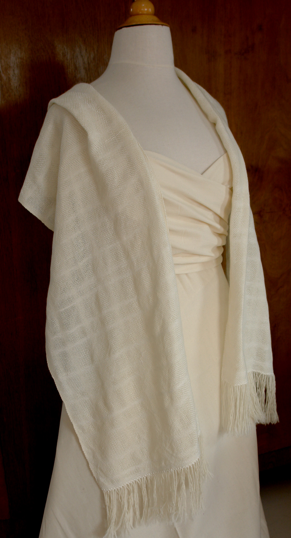 De beide shawls zijn gemaakt in een open weefsel door middel van ritmische rijging, het weven is op dezelfde manier ingeslagen als de rietrijging.